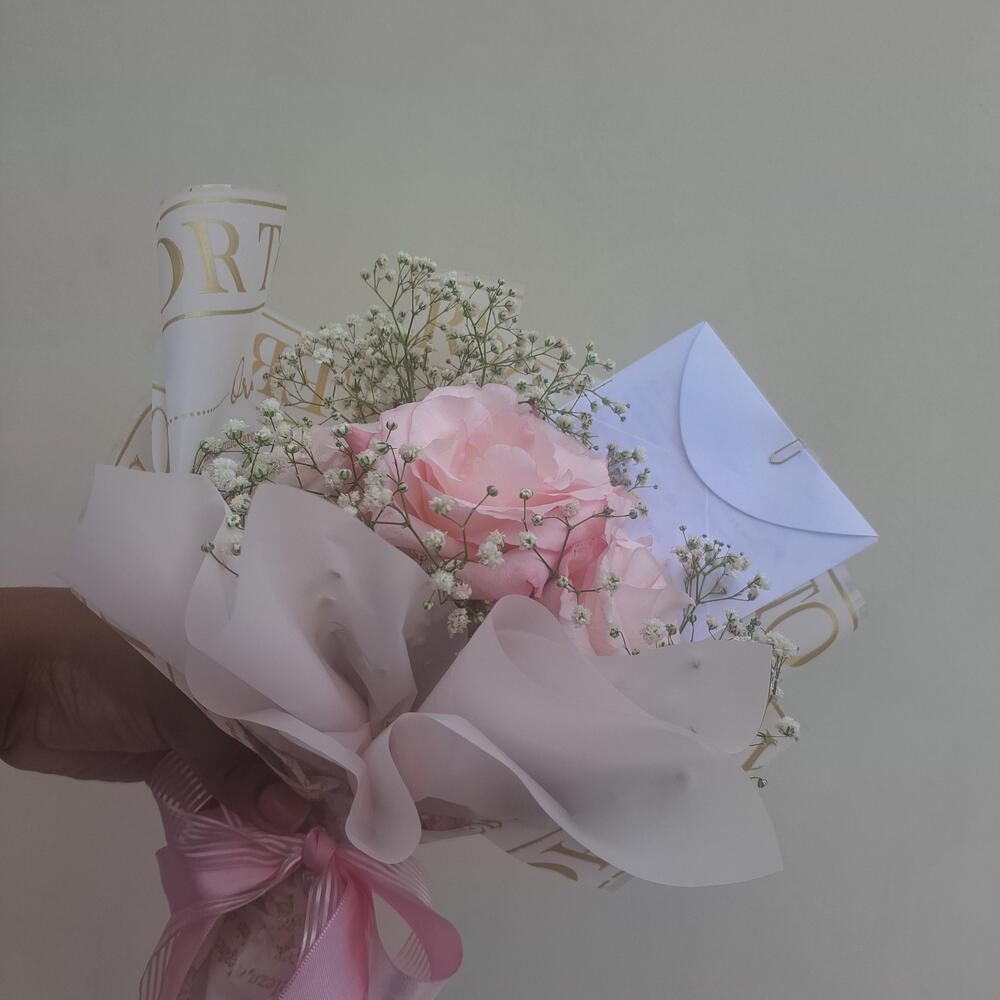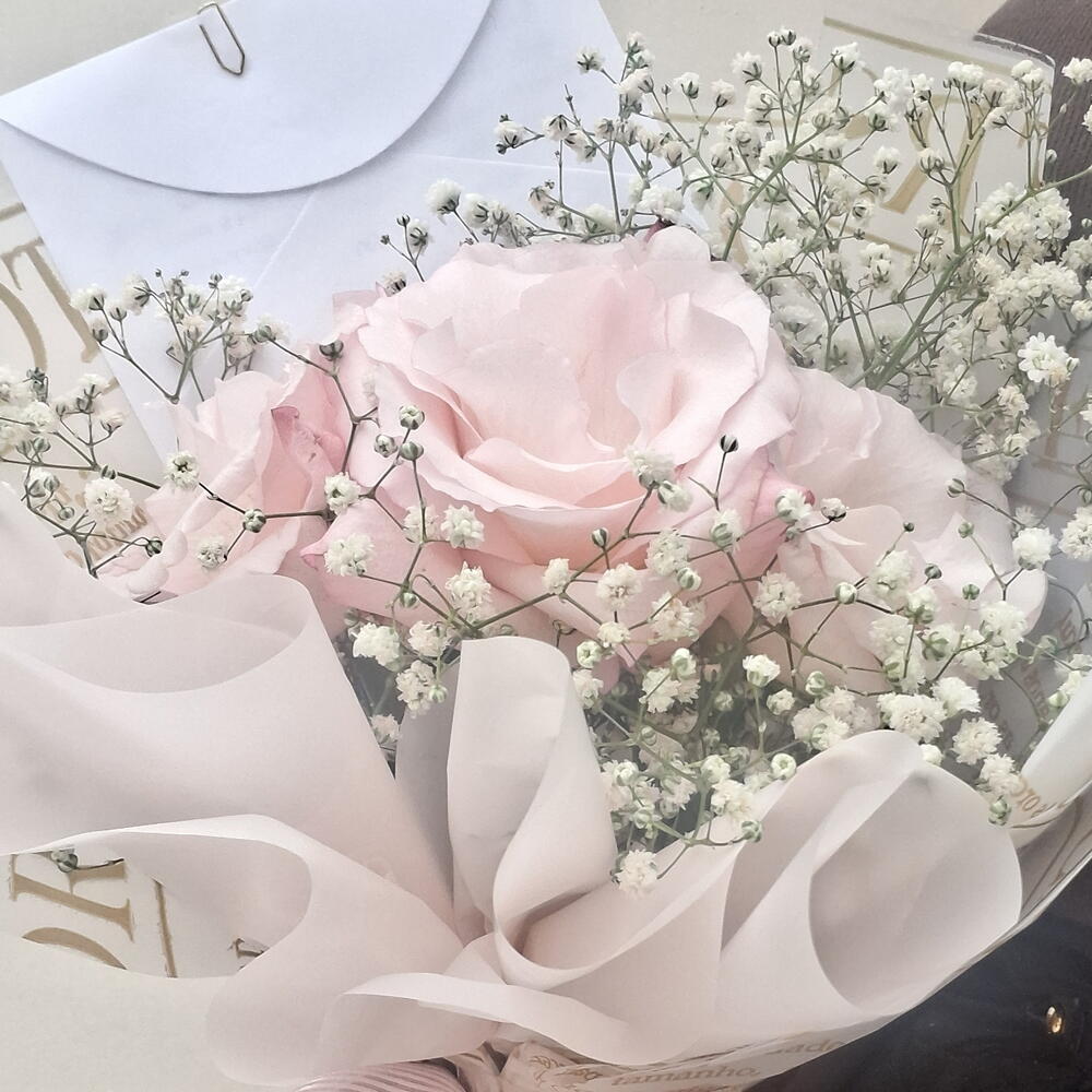 Buquê composto por 3 rosas rosa, selecionadas pela beleza e frescor, acompanhadas de gipsofila branca e folhagens delicadas. A cor rosa transmite carinho, afeto e admiração, tornando este arranjo a escolha perfeita para presentear em datas especiais ou simplesmente demonstrar sentimentos de forma elegante e delicada. Acabamento com embalagem premium e laço em tons suaves, garantindo um visual romântico e sofisticado.