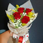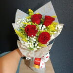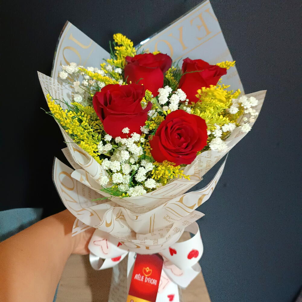 rosa vermelha - 4 un. gypisophila - 4 un. laço romântico - 1 un. folhagens verdes e tango amarelo - 5 un. embalagem poli acetinado love - 1 un.