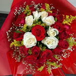 Este buquê espetacular composto por 18 radiantes rosas vermelhas e 6 puras rosas brancas é o presente perfeito para demonstrar seu amor e apreciação. É cuidadosamente montado para garantir que cada flor seja exibida para a sua beleza incomparável. Este é um presente que trará um toque de classe e elegância para qualquer ocasião.