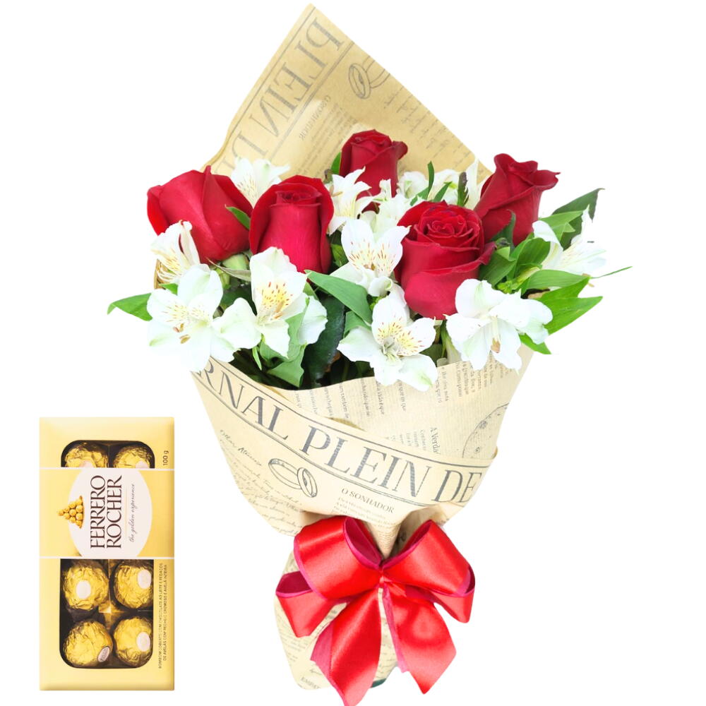 Buquê de Rosas Vermelhas e Astromelias com Ferrero