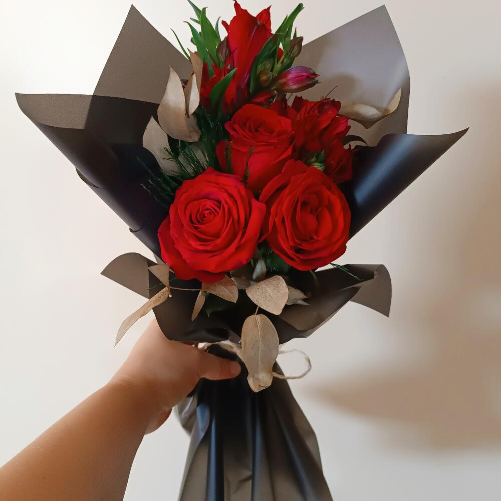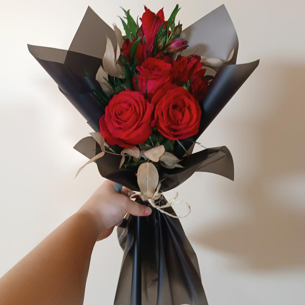 Buquê Intenso Minimalista Três rosas vermelhas, símbolos de amor verdadeiro, ao lado do eucalipto desidratado, que traz sofisticação e equilíbrio à composição. Envolto em embalagem preta, esse buquê carrega elegância e intensidade em cada detalhe. Um presente marcante, minimalista e cheio de significado perfeito para dizer “eu te amo” sem excessos, apenas com sentimento.