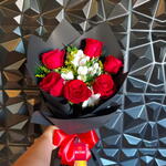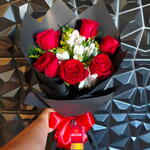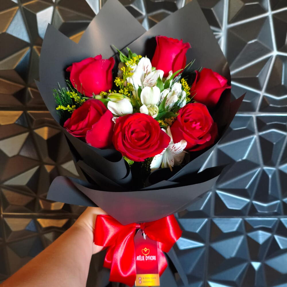 rosa vermelha - 6 un. laço de cetim vermelho - 1 un. alstroémeria branca - 3 un. embalagem poli acetinado preto - 1 un. folhagem verde e tango amarelo - 6 un.
