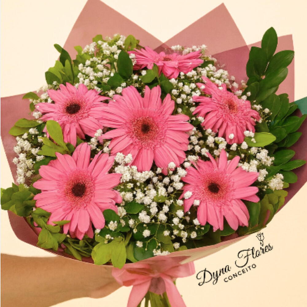 gérbera - 6 un. cartão mensagem - 1 un. folhagem verde - 1 un. embalagem e fita cetim - 1 un. gipsofilas - 1 un. tag - 1 un.