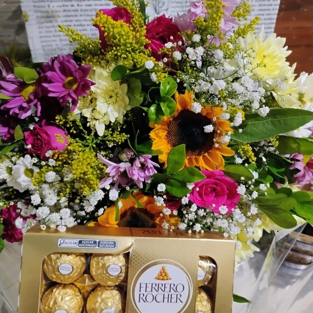 embalagem - 1 un. ferrero rocher 8 unidades - 1 un. folhagens - 1 un. laço - 1 un. flores variadas ( verificar disponibilidade via chat) - 7 un.