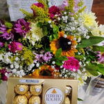 Desfrute de um momento de pura indulgência com o nosso presente de chocolate elegante e refinado. Este pacote inclui uma caixa com 8 deliciosos bombons Ferrero Rocher, cuidadosamente envolvidos em uma embalagem de luxo. A beleza do pacote é acentuada com a adição de uma variedade de flores coloridas (as opções estão sujeitas à disponibilidade e podem ser discutidas via chat). O visual é aprimorado com elegantes folhagens e um lindo laço. Este presente com chocolate é a escolha perfeita para sublinhar momentos especiais e expressar o cuidado e a consideração que você tem pelo destinatário.
