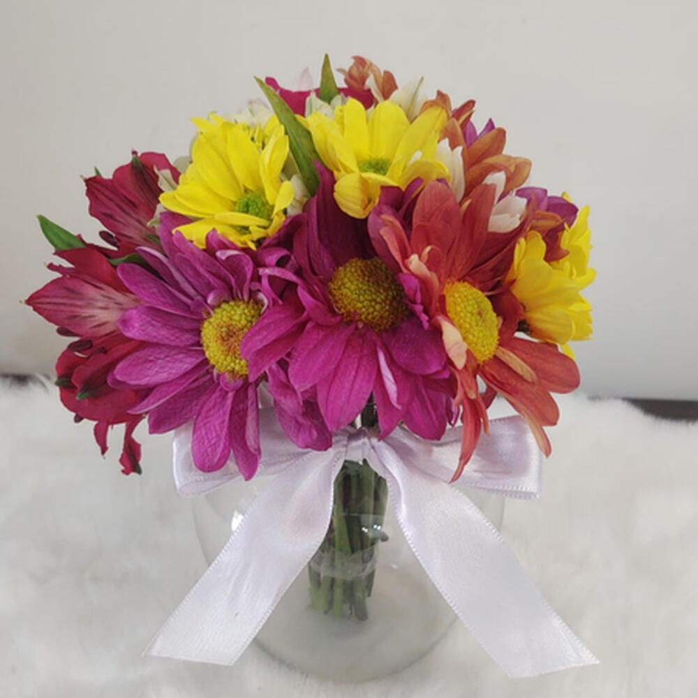 Este encantador vaso de flores contém 10 margaridas frescas, cuidadosamente dispostas e realçadas por um elegante laço de cetim. O vaso de vidro transparente adiciona um toque de elegância, permitindo que a beleza natural das flores brilhe intensamente. Perfeito para adicionar um toque de primavera a qualquer espaço.