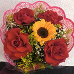 Este lindo buquê é composto por 4 rosas importadas, esbanjando exclusividade, juntamente com 1 radiante girassol que se destaca entre as flores. Além disso, o arranjo inclui folhagens cuidadosamente selecionadas, que adicionam um toque de frescor. Perfeito para presentear em ocasiões especiais, este buquê é sinônimo de elegância e sofisticação.
