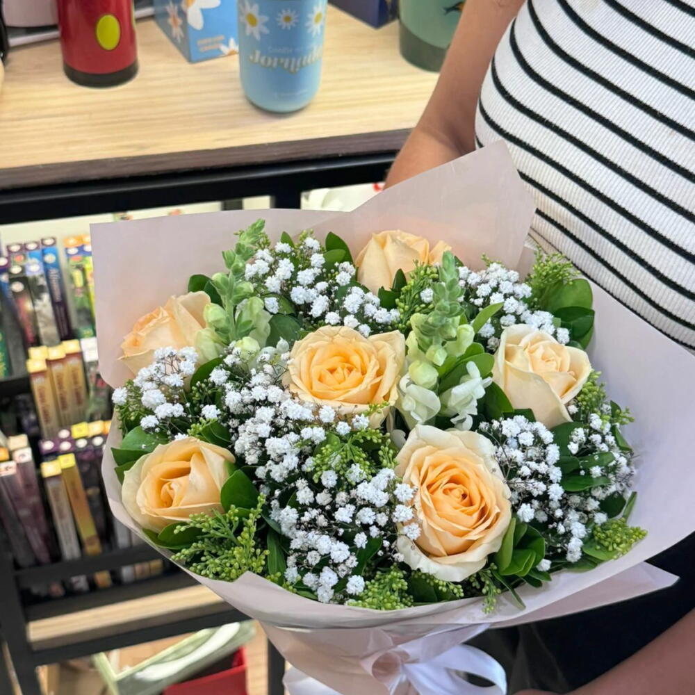 O Buquê elegancia reúne 06 rosas chá intensas, símbolo de carinho e elegancia, acompanhadas de delicadas flores do campo e folhagens selecionadas. Sua embalagem neutra e laço de cetim torna esse arranjo ainda mais encantador e sofisticado. Perfeito para surpreender em datas especiais como aniversários, e aquela amiga que merece todo amor do mundo.