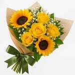 Encante-se com este lindo buquê composto por 2 radiantes girassóis e 4 rosas amarelas, simbolizando alegria e positividade. Complementado por uma folhagem fresca e delicados mosquitinhos brancos, o arranjo traz um toque de frescor e leveza. Todo o conjunto é cuidadosamente embrulhado em uma embalagem Kraft e finalizado com um laço especial, resultando na combinação perfeita para expressar seus sentimentos com estilo, sofisticação e muito carinho.