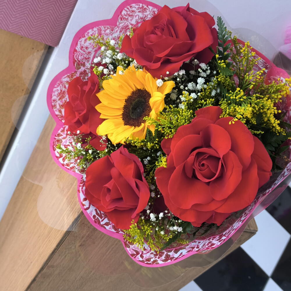 Este lindo buquê é composto por 4 rosas importadas, esbanjando exclusividade, juntamente com 1 radiante girassol que se destaca entre as flores. Além disso, o arranjo inclui folhagens cuidadosamente selecionadas, que adicionam um toque de frescor. Perfeito para presentear em ocasiões especiais, este buquê é sinônimo de elegância e sofisticação.