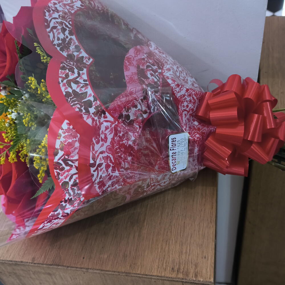 folhagens - 3 un. girassol - 1 un. rosa importadas - 4 un.