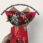 Este presente delicioso e elegante inclui 6 rosas pungentes, 3 hastes de alstroemeria vibrantes, um laço de borboleta para um toque de charme e uma caixa de bombons da Cacau Show, para adicionar um elemento doce. É a combinação perfeita de beleza sofisticada e tentação de chocolate.