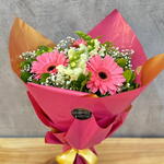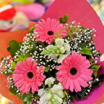 Este buquê cativante consiste em três gerberas naturais, suas pétalas coloridas e viçosas hipnotizam com sua beleza incomparável. O arranjo é complementado por uma única folhagem luxuriante, adicionando um toque de cor verde natural que contrasta perfeitamente com as flores. Cada detalhe do buquê é pensado, desde a embalagem do designer único até o laço gentilmente colocado à mão para enfeitar o conjunto. É uma escolha perfeita para demonstrar seu amor, carinho e admiração a alguém especial.