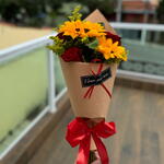 folhagens - 1 un. girassol - 2 un. rosa vermelhas - 2 un. laço em cetim - 1 un. embalagem karft - 1 un.