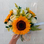 folhagens - 1 un. girassol - 3 un. rosa brancas - 6 un. embalagem celofane - 1 un. laço rústico - 1 un. plaquinha com foto - 1 un. com cartinha - 1 un.