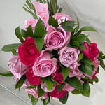 Este buquê é a personificação da elegância e sofisticação. Composto por 15 rosas cuidadosamente organizadas nos mais belos tons de rosa, lilas e pink, a sua beleza é realçada pela folhagem de ruscos incluída. Tudo isto é cuidadosamente envolto numa embalagem de celofane e finalizado com um laço de cetim, que adiciona um toque de luxo ao conjunto. Este buquê é perfeito para ocasiões especiais ou simplesmente para surpreender alguém de quem você gosta.