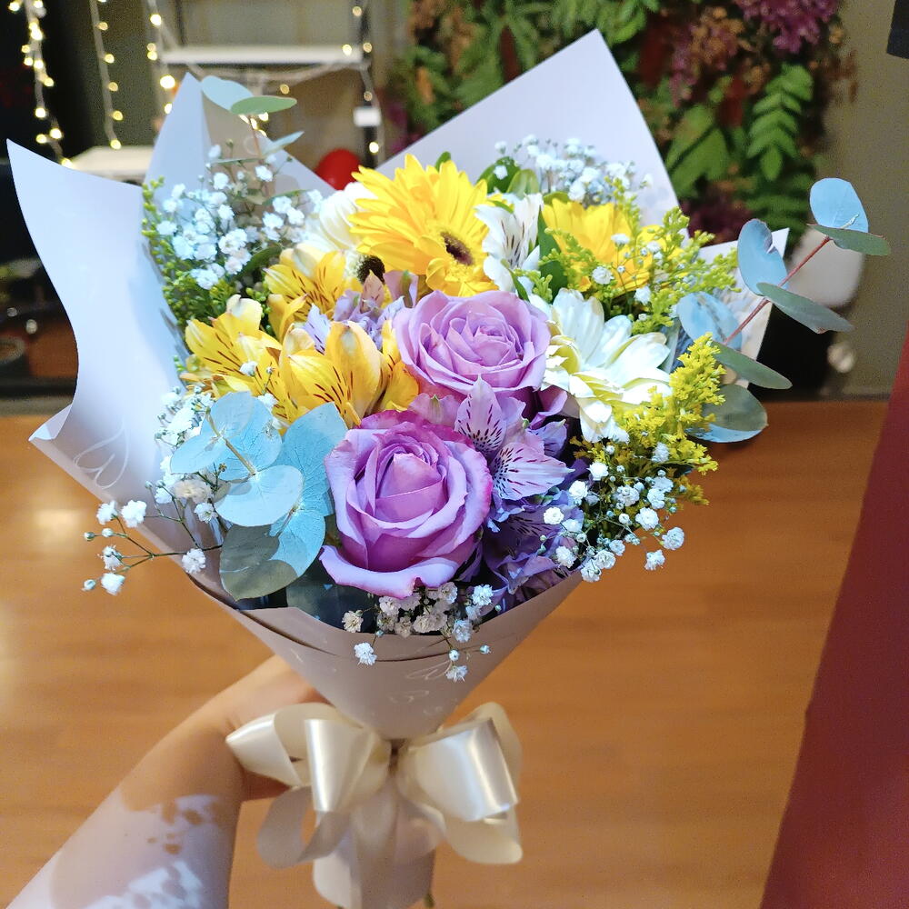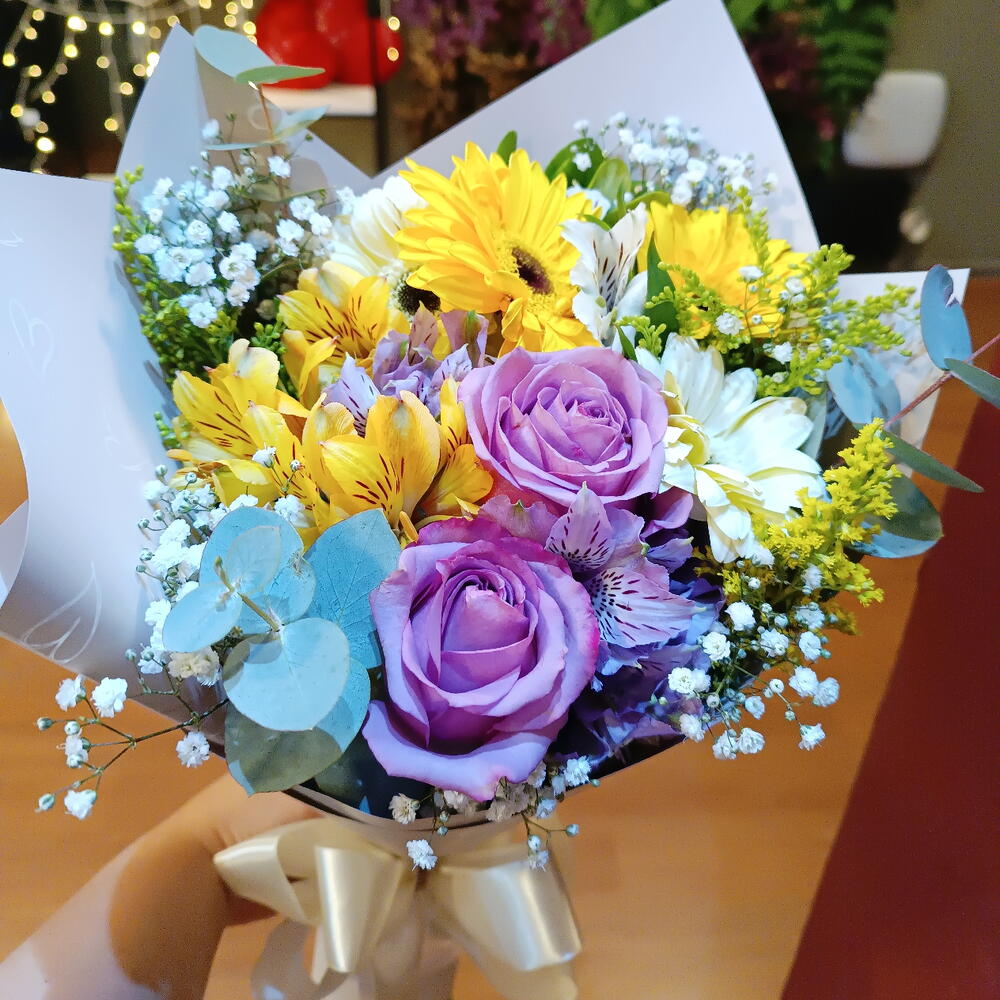 tango - 1 un. eucalipto - 1 un. rosa lilás - 2 un. astromelia amarela - 1 un. gérbera amarela - 2 un. gypisophila - 1 un. gérbera branca ou flor do campo - 2 un. astromelia lilás ou marsala - 1 un.