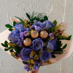 folhagens - 1 un. laço - 1 un. embalagem kraft - 1 un. rosa lilás - 10 un. chocolates ferrero rocher presos em hastes dentro do buquê - 3 un.