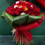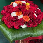 rosa coloridas nacionais - 100 un. envolto com folhagem de canoa e acabamento em tela - 1 un.