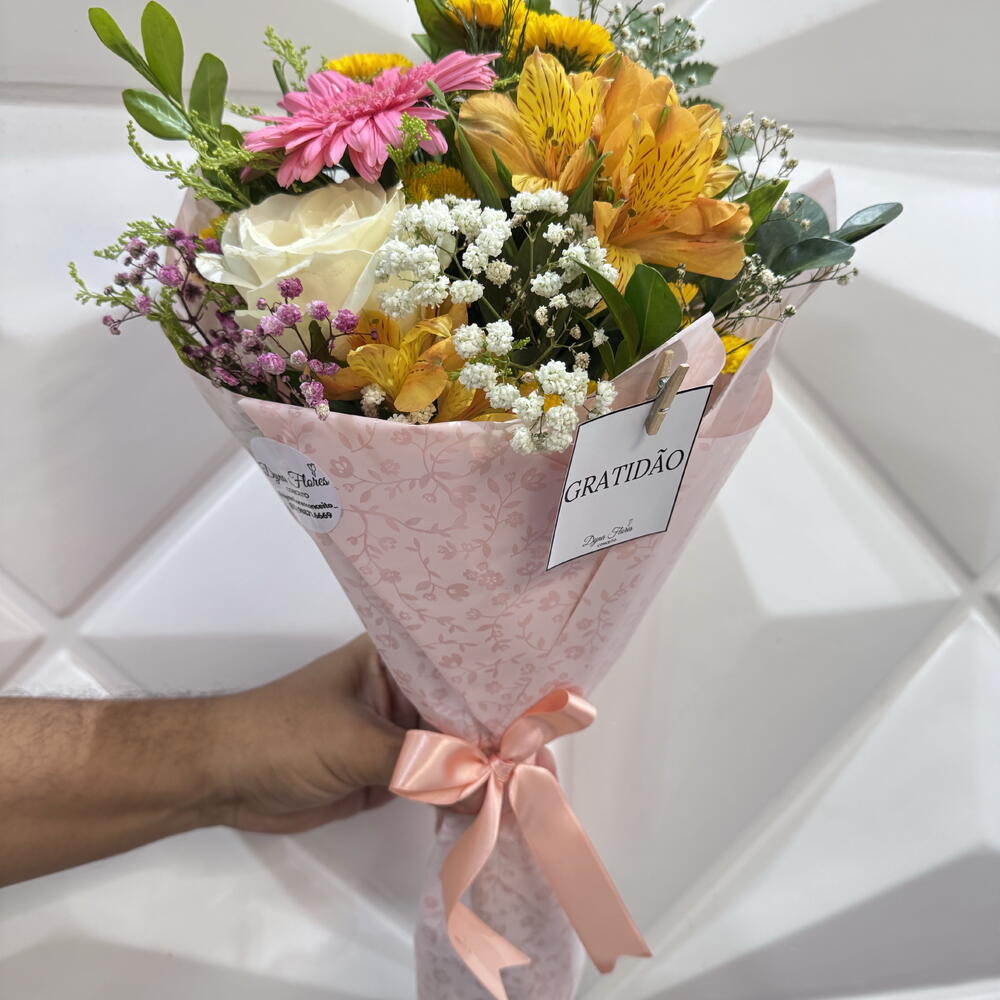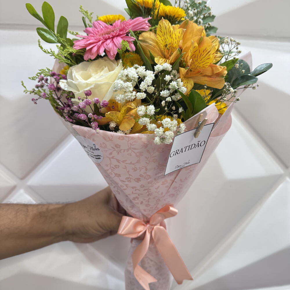 rosa - 1 un. gérbera - 1 un. cartão mensagem - 1 un. gipsofila - 1 un. folhagem verde - 1 un. astromelia - 1 un. tag - 1 un. embalagem e laço cetim - 1 un.