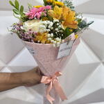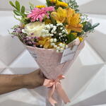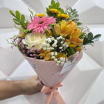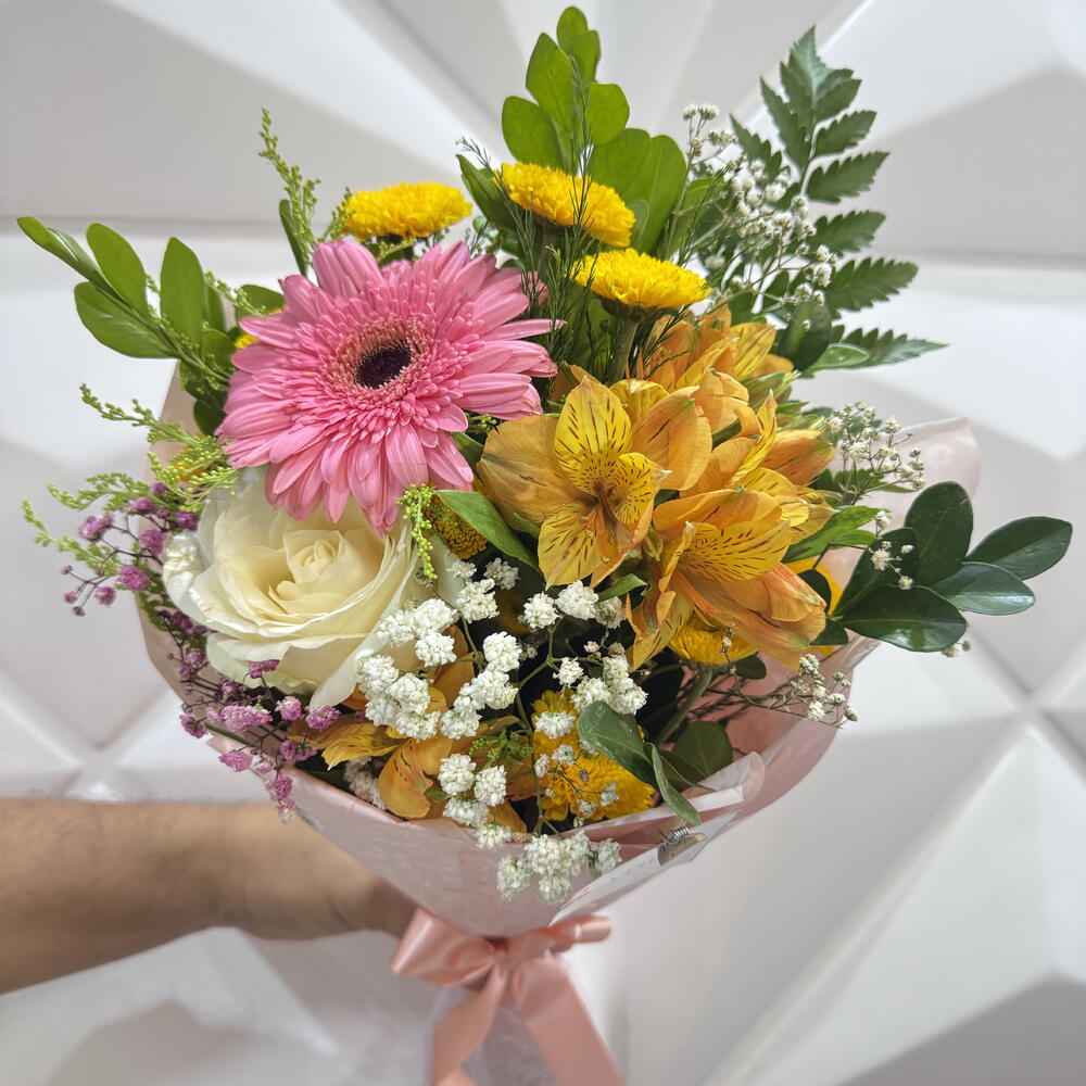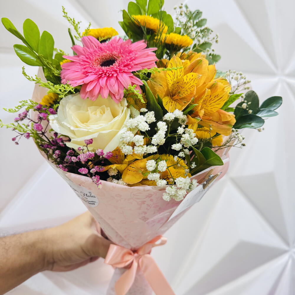 Este elegante buquê é uma composição fascinante de flores premium e toques delicados. Ele contém uma rosa de alta qualidade, uma gérbera brilhante, um pouco de encantadora gipsofila e uma astromélia deslumbrante, tudo deliciosamente montado entre uma seleção de folhagem verde vibrante. O buquê dez cuidadosamente arranjado e envolvido em refinada embalagem com um romântico laço de cetim. Para despertar ainda mais sorrisos, ele vem com um cartão de mensagem personalizável e uma tag integrada. Um presente perfeito para qualquer ocasião.