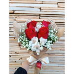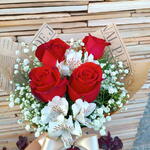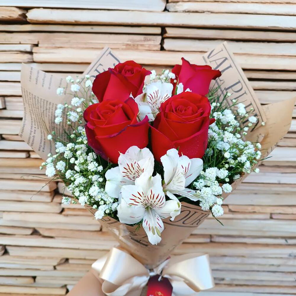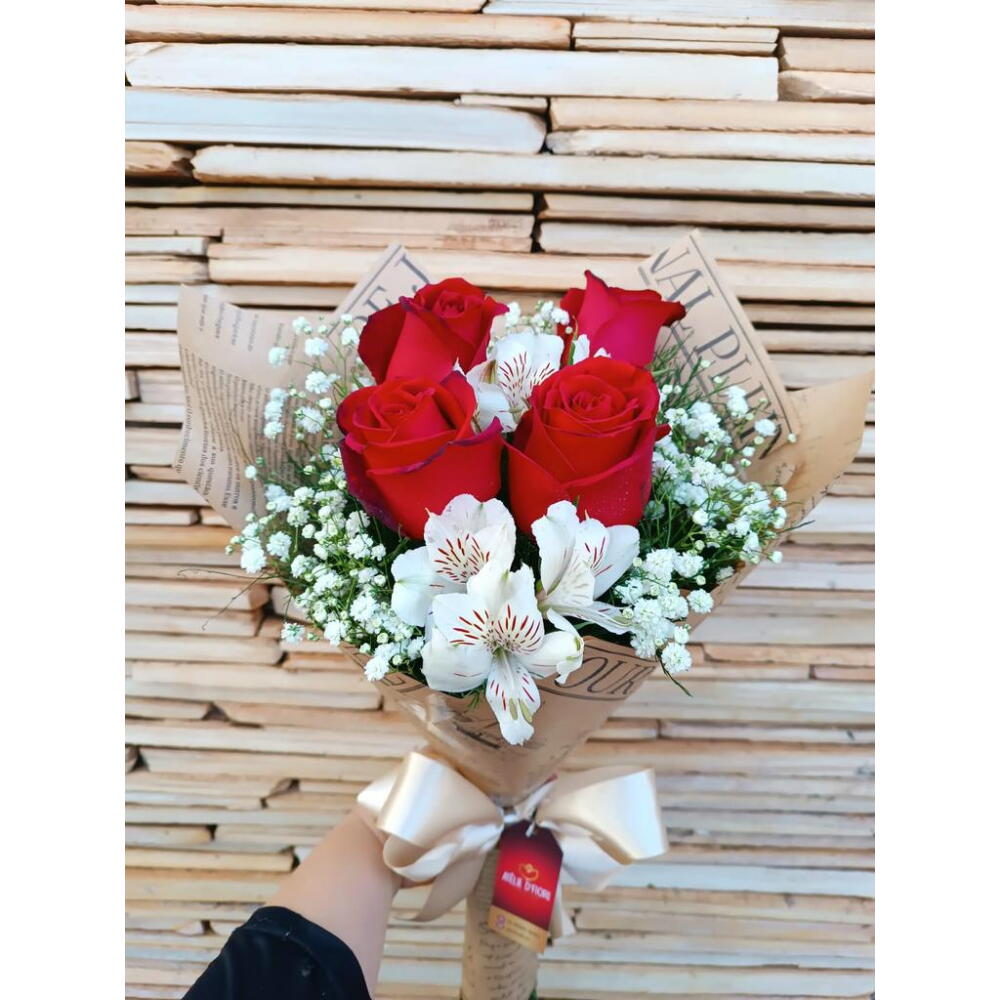 Este buquê maravilhosamente deslumbrante oferece uma experiência inesquecível. Composto por 4 luxuosas rosas vermelhas, é acompanhado por um toque delicado de flores brancas, Gypisophila e Astromelia, proporcionando um contraste de cores vibrantes. O bouquet é cuidadosamente embalado em um Kraft Journal, com um laço delicado que acrescenta um toque de sofisticação. Perfeito para expressar amor, apreciação ou carinho, este bouquet é garantido para encantar e surpreender.