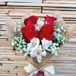 rosa vermelhas - 4 un. toque delicado de flores brancas - 1 un. gypisophila e astromelia - 1 un. embalagem kraft journal com laço delicado - 1 un.