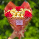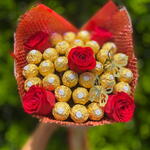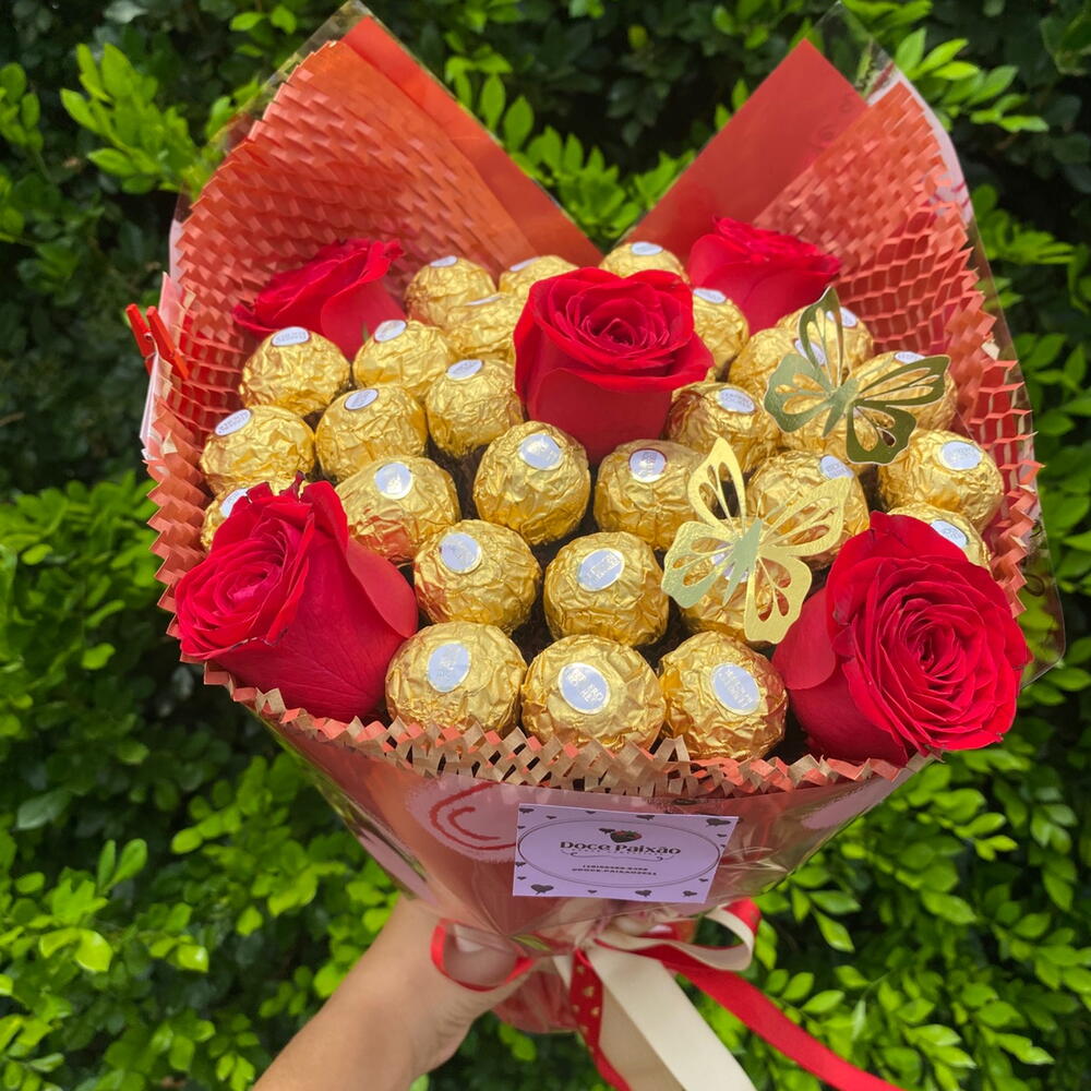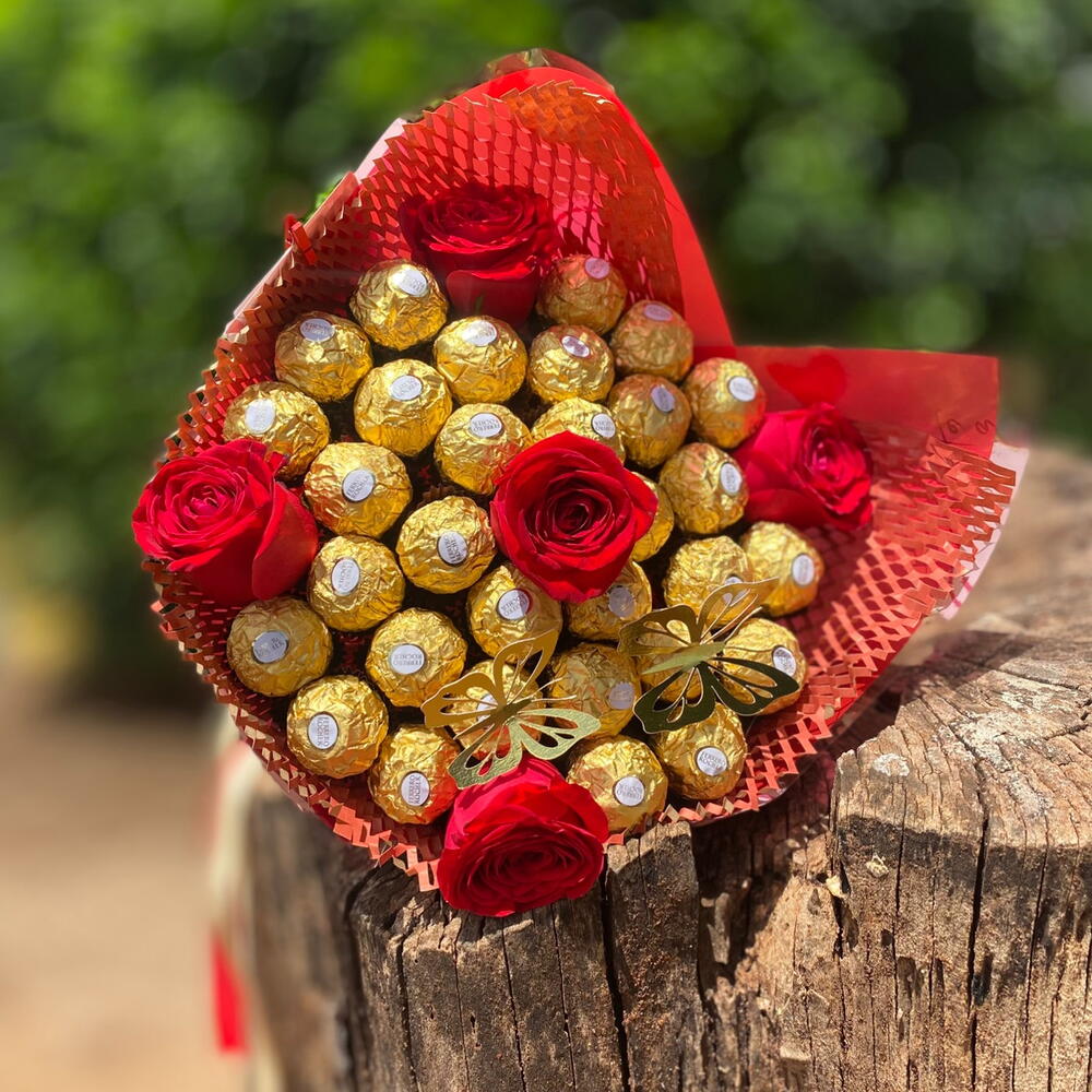 Este presente elegante vem com 30 deliciosos Ferrero Rocher, acompanhados de 5 rosas luxuosas. A embalagem sofisticada amarrada com um laço fresco adiciona um toque especial a este presente. Para finalizar, uma borboleta decorativa agrega um charme extra. Perfeito para marcar qualquer ocasião ou simplesmente para demonstrar o quão especial é a sua pessoa amada.