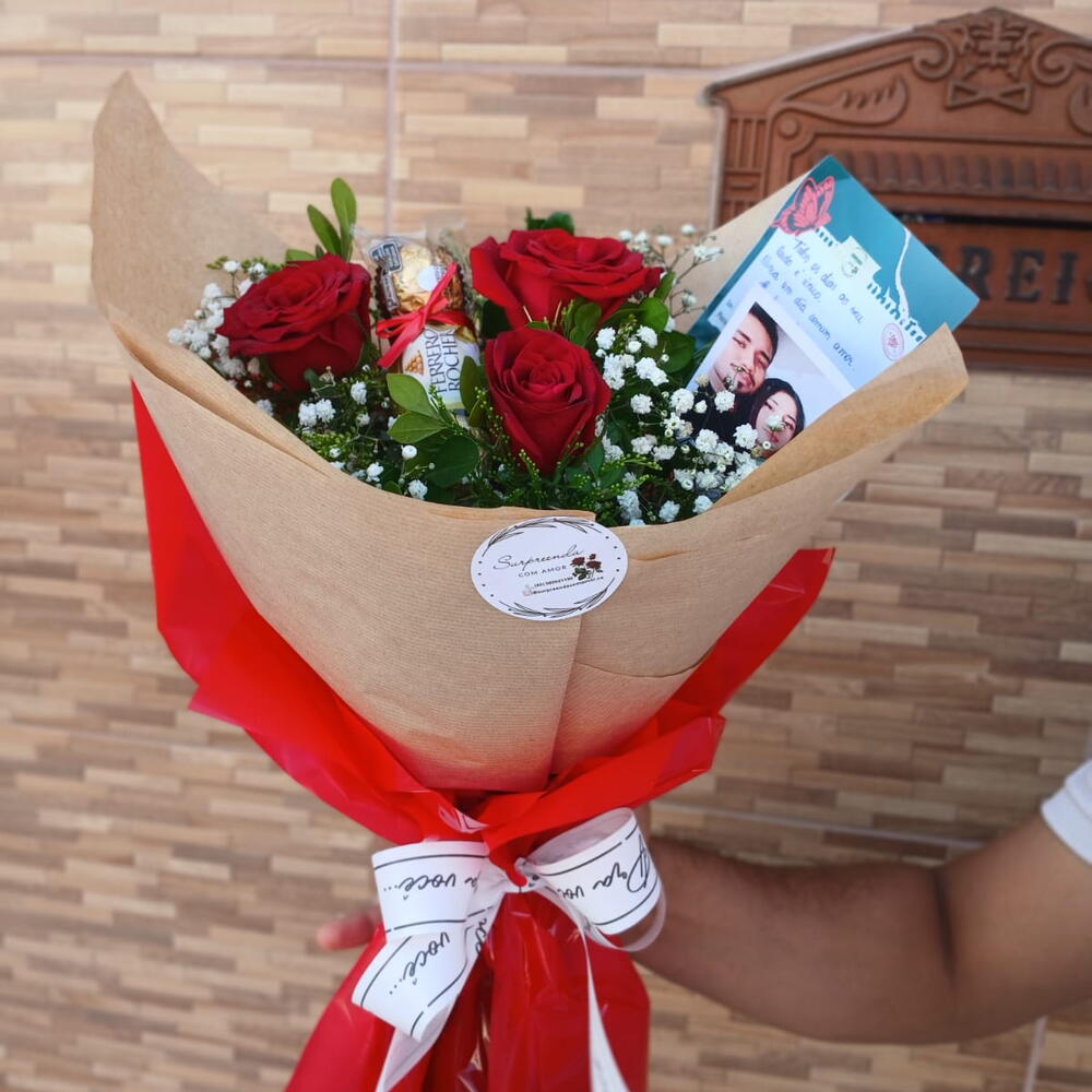 folhagens - 1 un. laço - 1 un. rosa vermelhas - 3 un. mosquitinhos - 1 un. foto - 1 un. embalagem karft - 1 un. trio ferreiro rocher - 1 un.