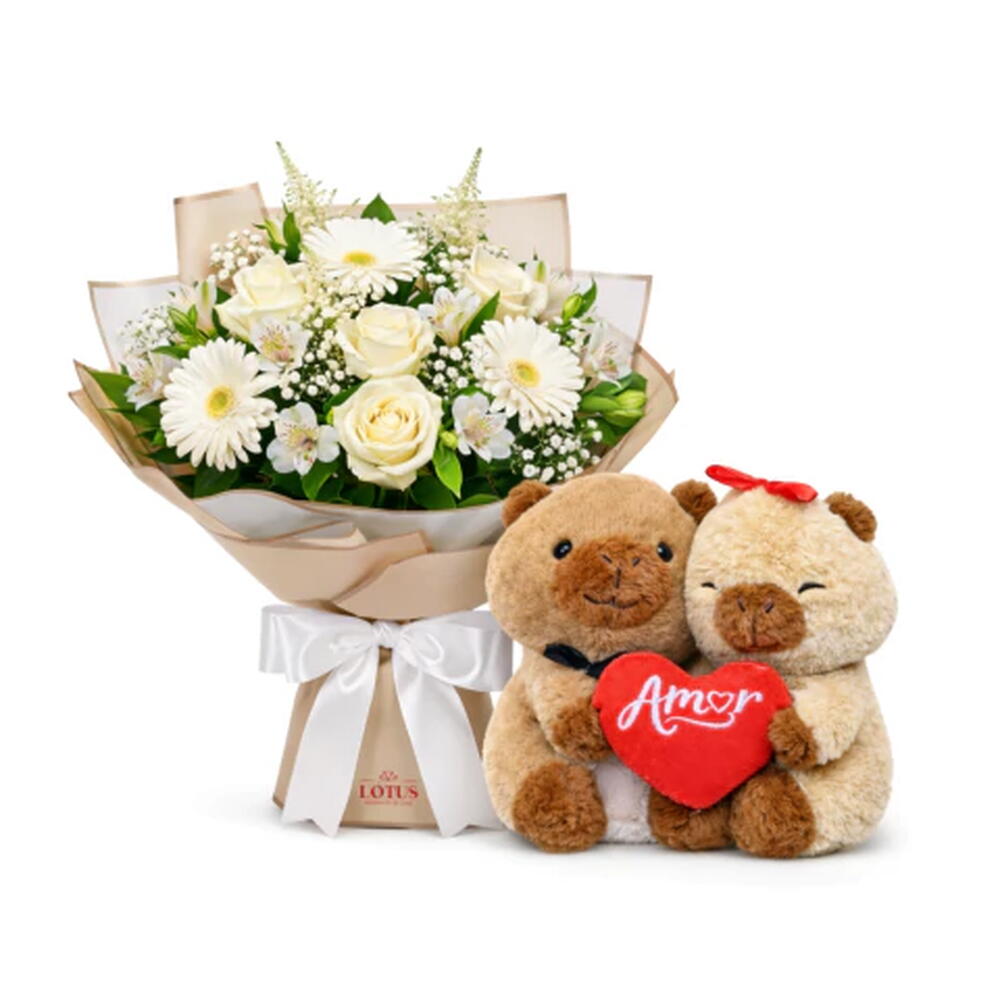 ENCANTE, SURPREENDA, EMOCIONE, COM: Buquê elegante em tons de branco, com flores delicadas que simbolizam pureza, carinho e afeto, acompanhado de uma pelúcia de capivara apaixonada. ITENS QUE COMPÕEM O SEU PRESENTE 4 Rosas brancas 3 Gerberas brancas Folhagens e msoquitinhos 1 pelúcia de capivara com coração “Amor”