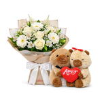 rosa brancas - 4 un. gerberas brancas - 3 un. pelúcia de capivara com coração “amor” - 1 un. folhagens e msoquitinhos - 2 un.
