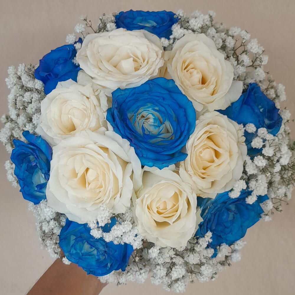 rosa brancas - 6 un. laço - 1 un. rosa azuis - 7 un. gipsofila branco - 1 un.
