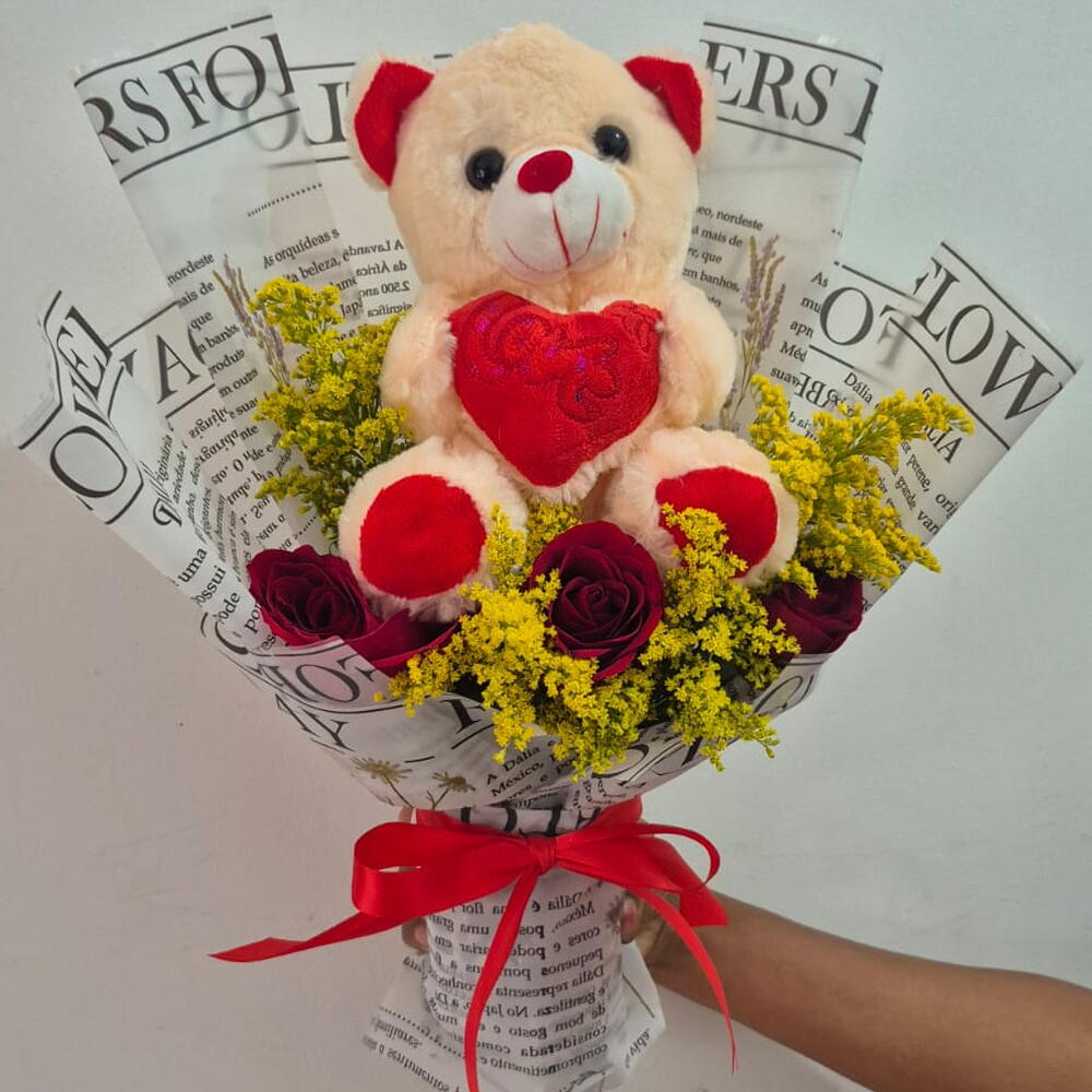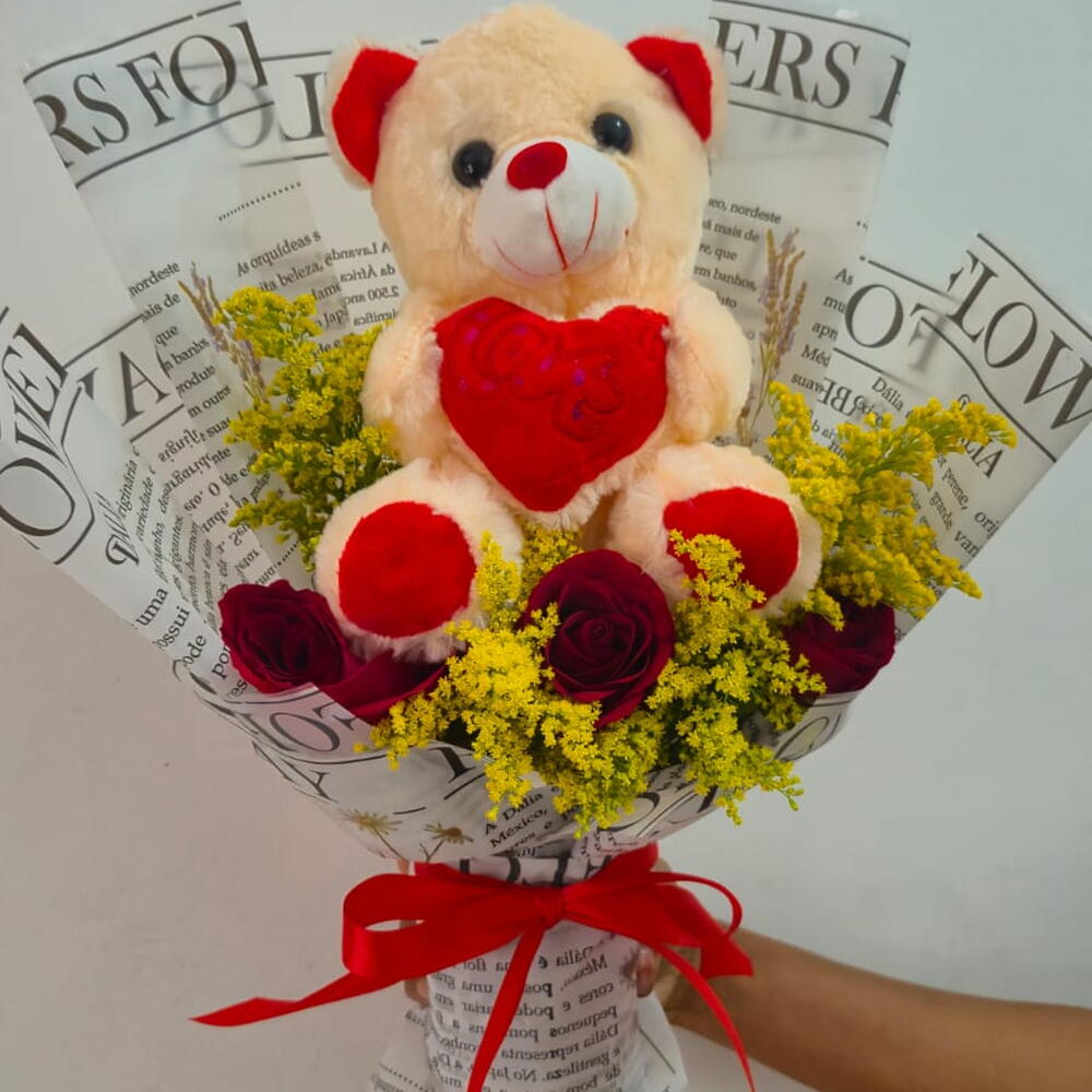 Este buquê deslumbrante é uma composição artística do melhor que a natureza tem a oferecer. Composto por uma fofa pelúcia singular que traz um toque de aconchego e ternura ao conjunto. Ele se harmoniza com três encantadoras rosas vermelhas, manifestando paixão e amor. O esplendor dessas flores é realçado por quatro tangos exuberantes que trazem um elemento de surpresa e requinte ao buquê. Esta é mais do que uma simples junção de flores e pelúcia; é uma declaração de afeto que fará o destinatário se sentir verdadeiramente especial.
