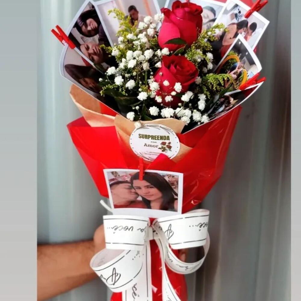folhagens - 1 un. laço - 1 un. mosquitinhos - 1 un. fotos polaroid - 6 un. rosa naturais - 2 un. embalagem moderna - 1 un.