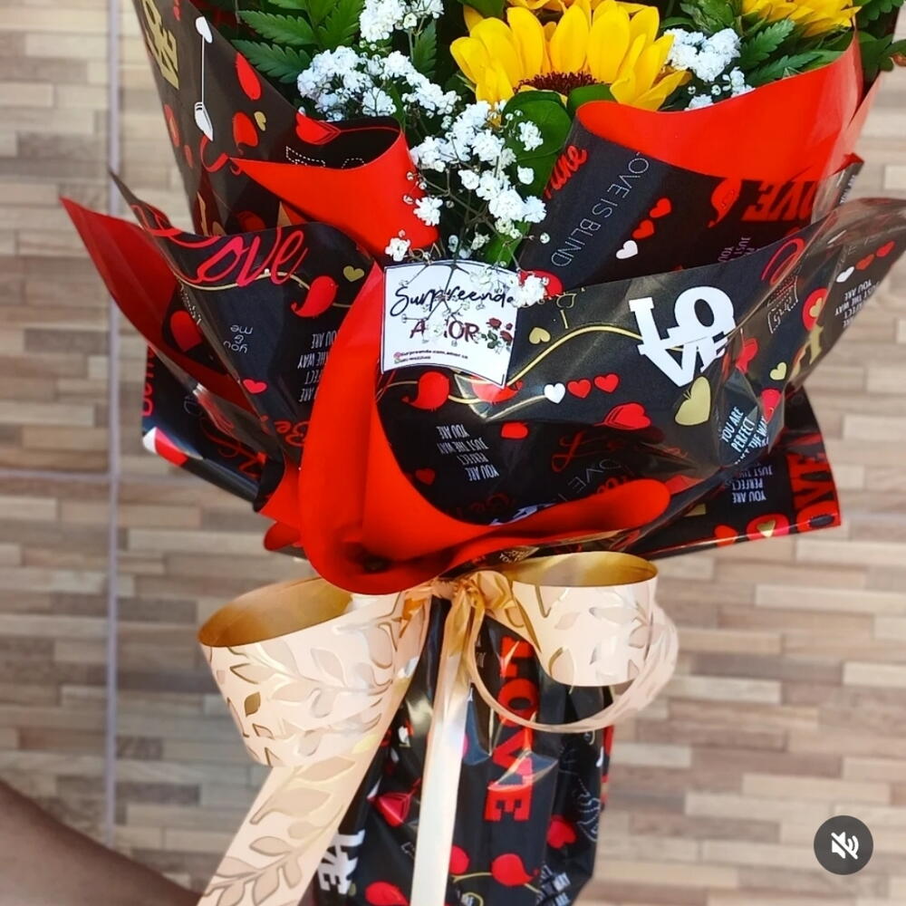 embalagem - 1 un. laço - 1 un. girassois naturais - 5 un. ramagem - 2 un.