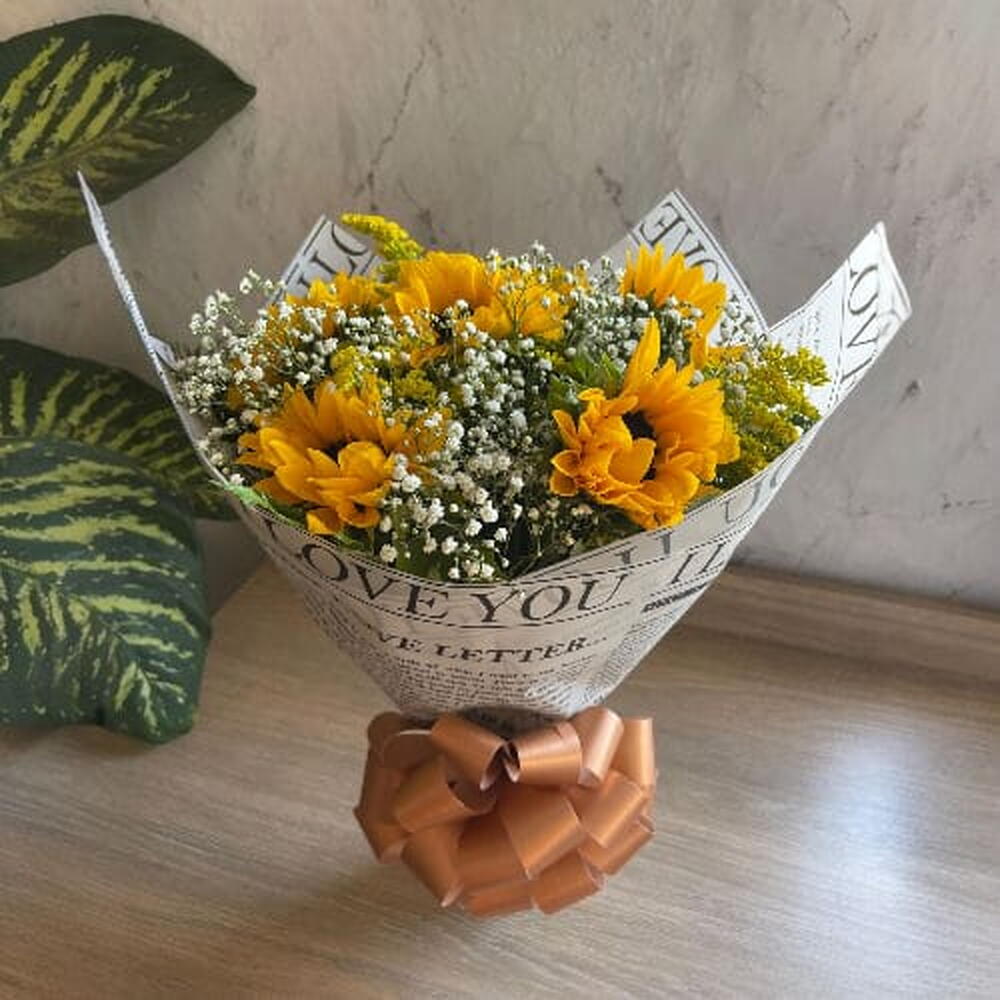 Este delicado buquê combina perfeitamente a beleza vibrante de 1 girassol, com a calma e a generosidade de 1 folhagem de qualidade. Complementado por 1 unidade de gipso e 1 unidade de flores da época para proporotionar uma rica diversidade de texturas e cores. Tudo isso apresentado de forma elegante em 1 sofisticada embalagem. Um presente encantador para todas as ocasiões.