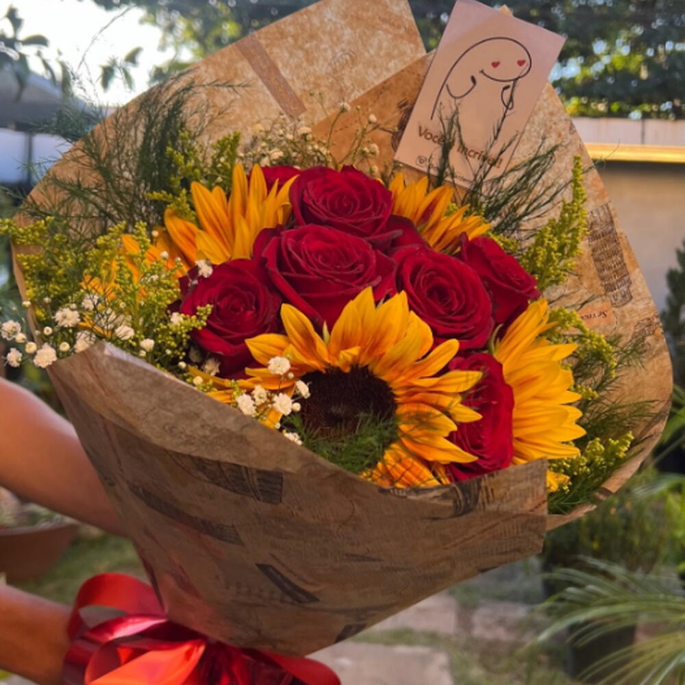 O Buquê Girassol com Rosas Vermelhas é uma combinação apaixonante e cheia de personalidade. Une o brilho do girassol com a intensidade das rosas vermelhas, criando um presente que transmite carinho, amor e admiração. Perfeito para surpreender em momentos especiais.