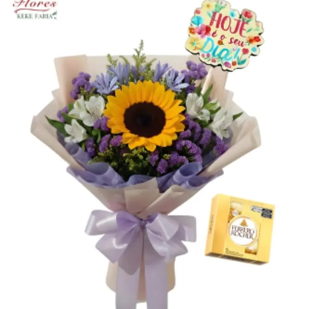 Este presente incrivelmente doce e charmoso combina o natural e o delicioso em um pacote deslumbrante. Ele contém um girassol alegre e vibrante, complementado com astromélias brancas etéreas e delicadas sempre vivas lilás, todos organizados em um arranjo deslumbrante com um toque de tango exótico. Para adoçar o presente, incluímos quatro deliciosos chocolates Ferrero Rocher, conhecidos por sua qualidade e sabor irresistíveis. E para torná-lo ainda mais especial, ele vem com uma plaquinha decorativa com a frase hoje é o seu dia, uma lembrança amorosa do seu carinho. Tudo isso é lindamente embalado e adornado com um laço elegante, pronto para iluminar o dia de quem o receber.