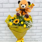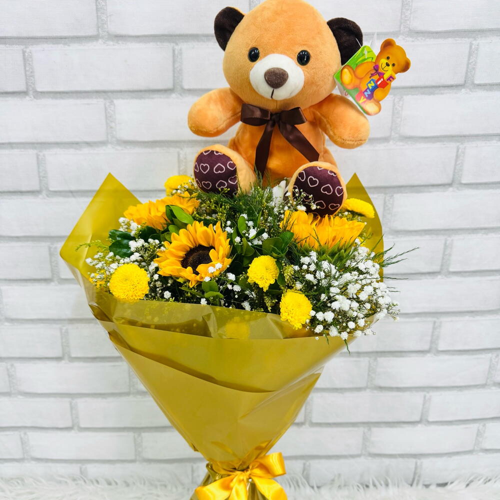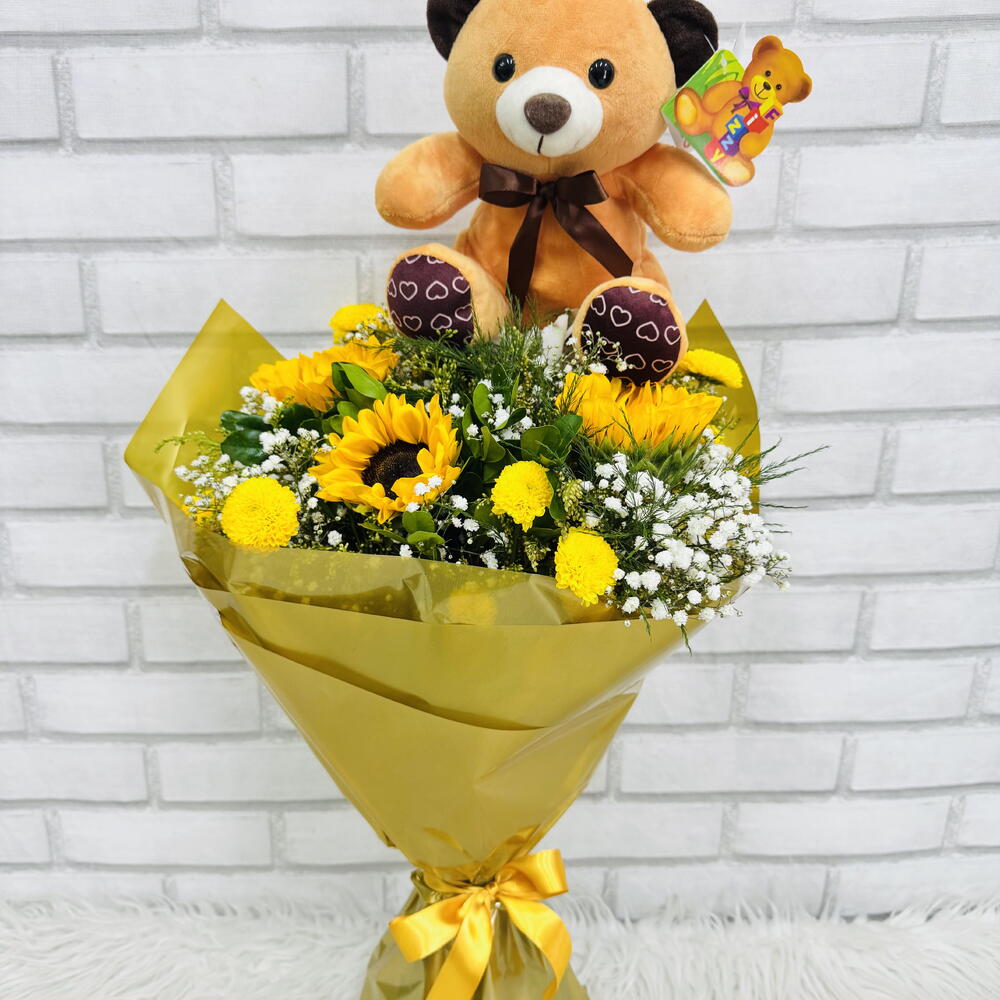 Este lindo buquê contém 3 unidades de girassóis emparelhados com gipsofila para adicionar um toque de leveza e frescor. Acompanhado por 1 unidade de murta, que realça a composição com um tom verde vibrante, e enriquecido com 1 unidade de folhagem e mini flores decorativas para um acabamento encantador. Tudo isso cuidadosamente embalado em uma embalagem especial com 1 laço delicado e acompanhado por um cartão de mensagem personalizado. É o presente perfeito para momentos especiais!