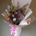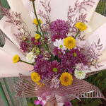 Buquê Inspirado nos mercados florais da Índia, com mix de flores de campo e tons quentes que transmitem leveza, alegria e espiritualidade. Composto por flores de campo coloridas em tons lilás, branco e amarelo, finalizado em papel rosé e laço pink. Ideal para presentear com leveza e afeto.