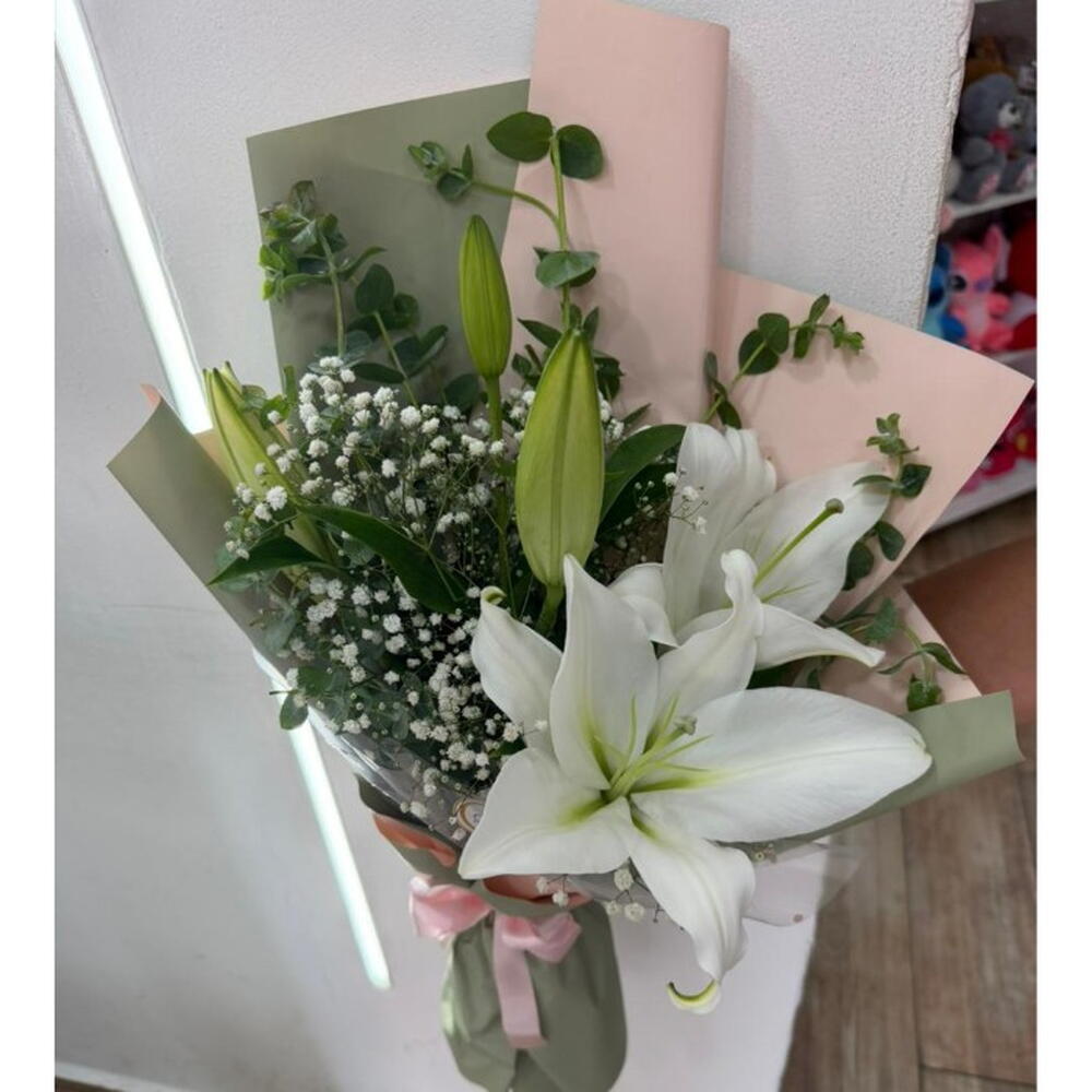 A delicadeza do lírio branco tornará este buquê encantador. Perfeito para ocasiões especiais, ele traz elegância e sofisticação, além de transmitir sentimentos positivos.