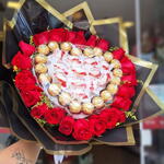 Encante-se com este incrível buquê, a combinação perfeita de elegância e sabor. Composto por 25 rosas finamente selecionadas, que trazem um toque de romantismo e sofisticação. Acompanhado por 20 deliciosos bombons Ferrero Rocher e 12 bombons Raffaello, que prometem adoçar seu dia de forma irresistível. Este buquê também conta com delicadas folhagens que adicionam um charme especial à composição. Para finalizar, inclui uma elegante embalagem e um laço, dando aquela pitada extra de sofisticação e elegância. Este buquê é a escolha perfeita para impressionar em qualquer ocasião.