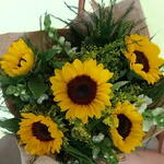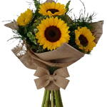 Buquê raio de sol com cinco hastes de girassóis, um toque de boca-de-leão branca, tango e folhagens verdejantes. Uma combinação luminosa e elegante, perfeita para presentear e transmitir alegria, carinho e energia positiva em qualquer ocasião.