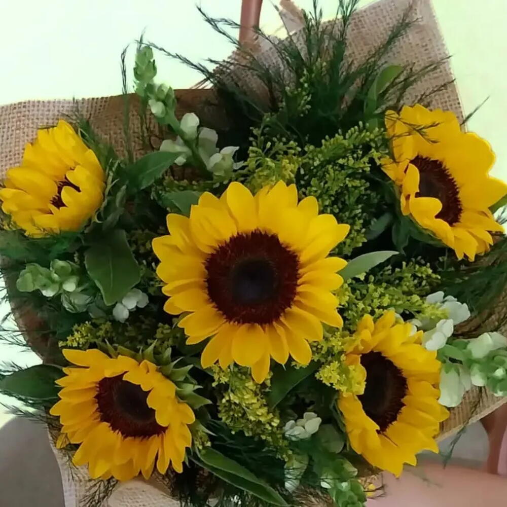 Buquê raio de sol com cinco hastes de girassóis, um toque de boca-de-leão branca, tango e folhagens verdejantes. Uma combinação luminosa e elegante, perfeita para presentear e transmitir alegria, carinho e energia positiva em qualquer ocasião.