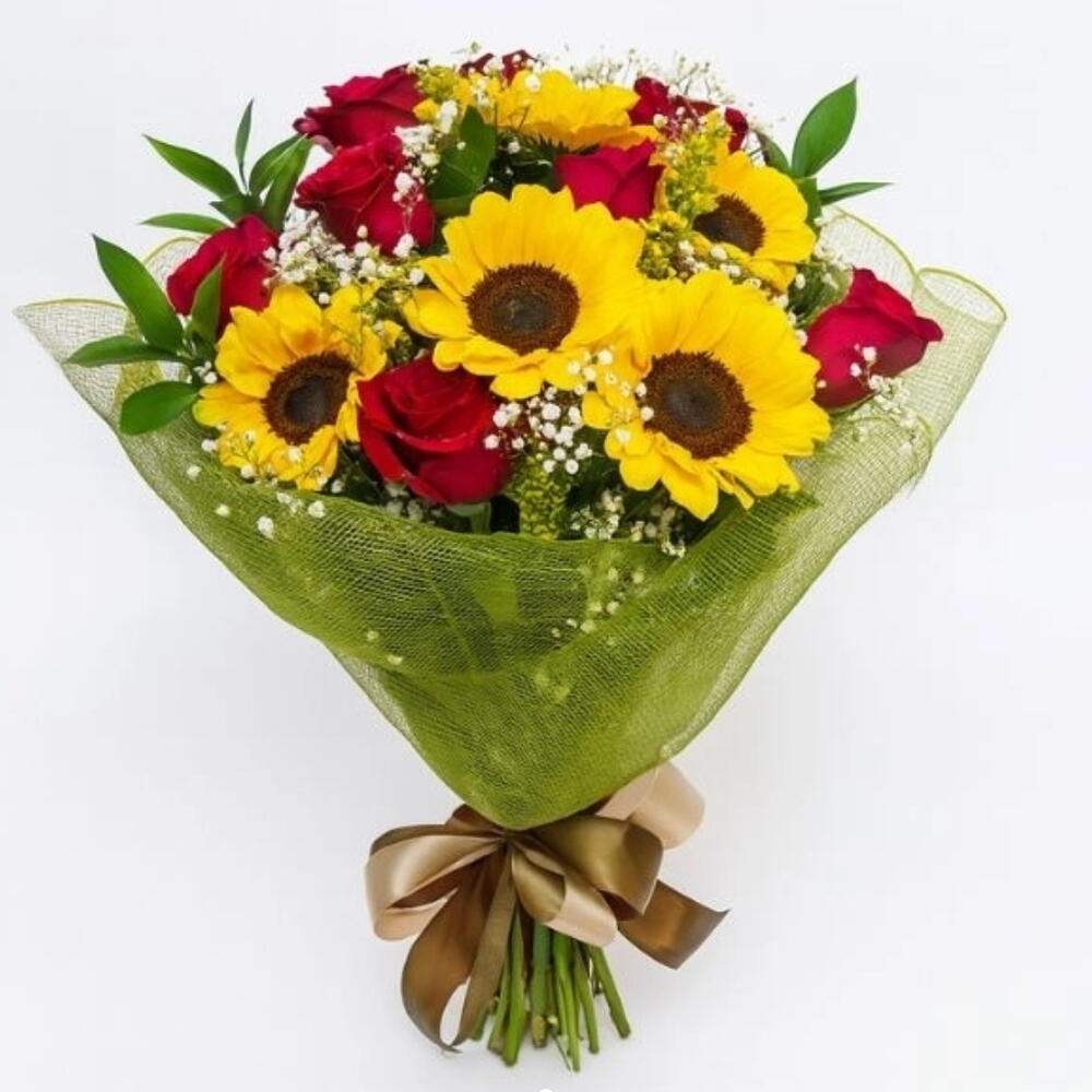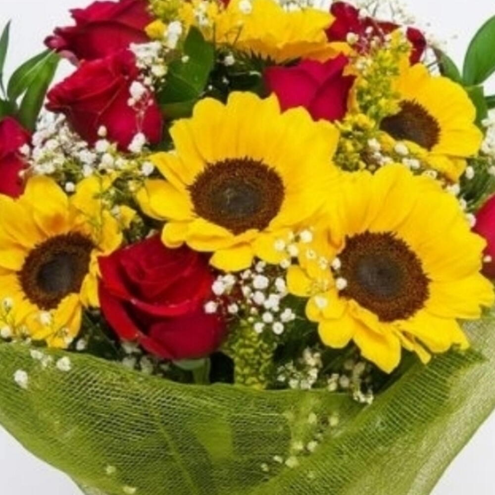 Encante-se com este lindo Buquê de girassóis brilhantes, rosas vermelhas emocionantes e toques delicados de mosquitinhos, todos harmoniosamente arranjados entre a elegante folhagem. Completado com um laço especial e uma embalagem em tela requintada, este arranjo floral oferece uma expressão visual vibrante de puro amor e apreciação. É o presente perfeito para celebrar um aniversário ou simplesmente para surpreender alguém especial.