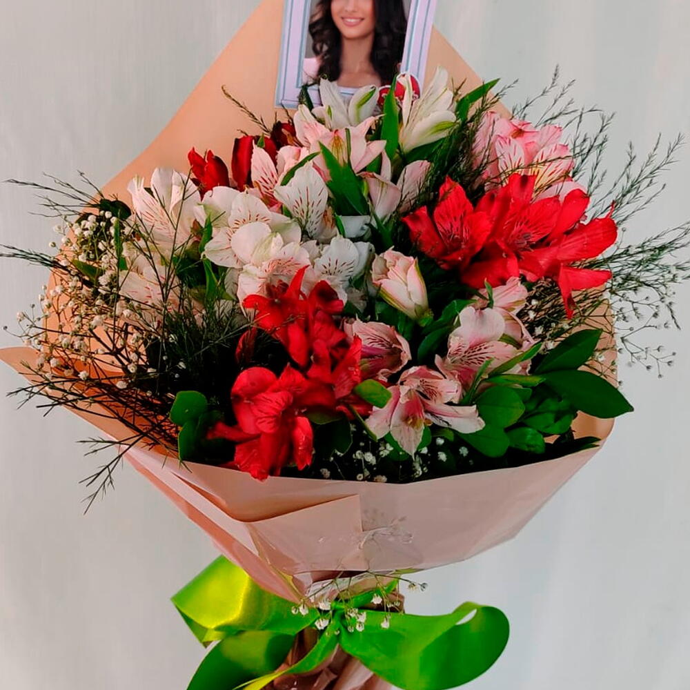 embalagem - 1 un. folhagens - 1 un. laço - 1 un. astromelias - 1 un. foto - 1 un.