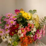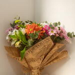alstroemerias - 5 un. folhagens verdes - 1 un. eucaliptos - 1 un. laço fios de ráfia - 1 un. crisântemo mistos - 12 un. papel kraft e celofane - 2 un.
