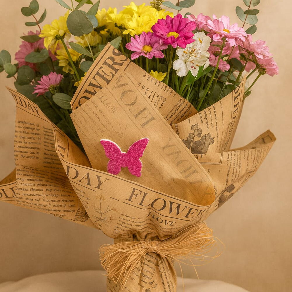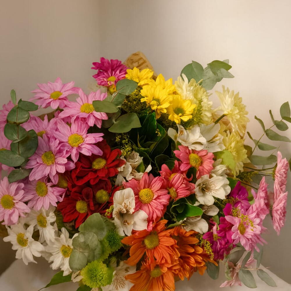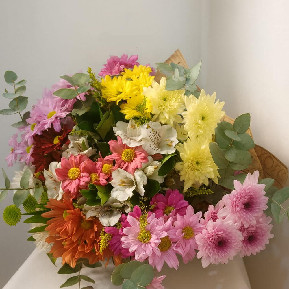 alstroemerias - 5 un. folhagens verdes - 1 un. eucaliptos - 1 un. laço fios de ráfia - 1 un. crisântemo mistos - 12 un. papel kraft e celofane - 2 un.