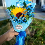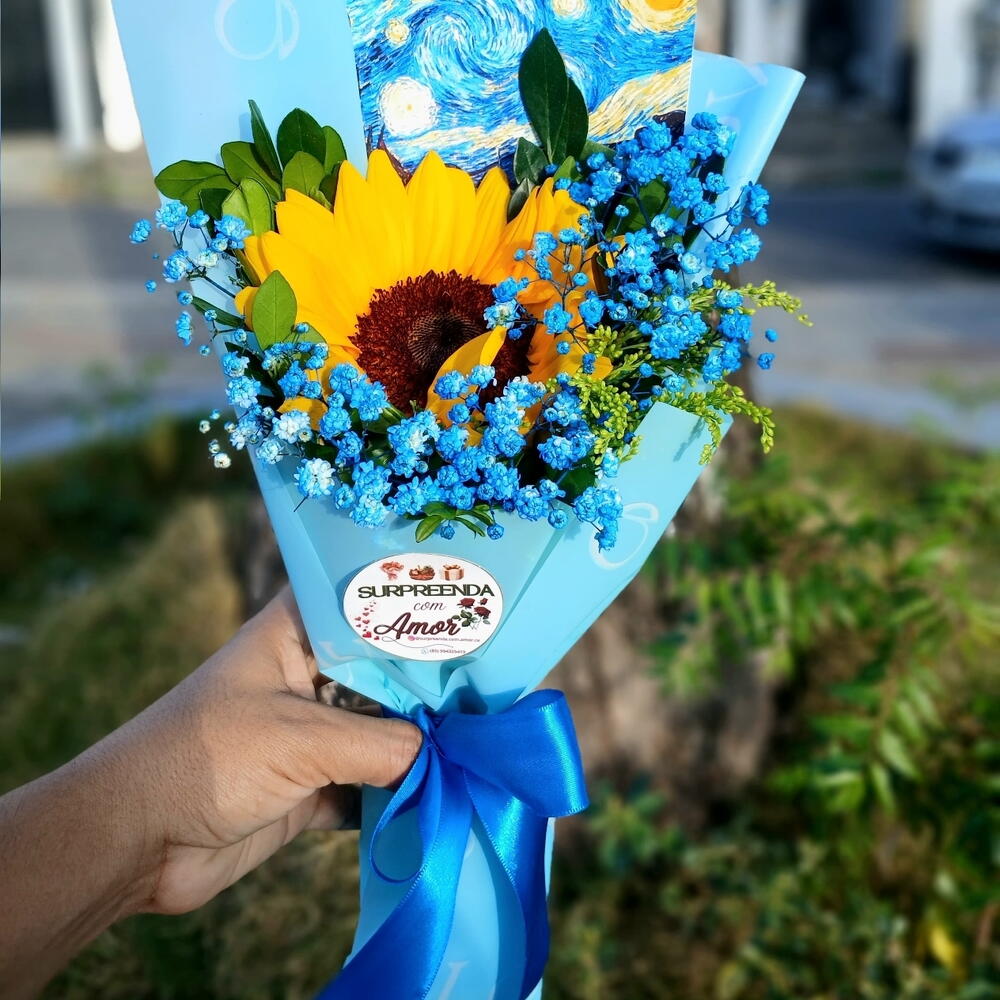 Deleite-se com este deslumbrante Buquê, cujo principal destaque é o girassol natural, que realça qualquer ambiente com sua exuberância. A decoração é complementada com um fino laço de cetim, adicionando um toque delicado e sofisticado. Este buquê também apresenta uma requintada arte de Van Gogh - o Quadro Noite Estrelada - que infunde na peça um caráter artístico e único. Tudo vem embalado em uma designer embalagem, tornando-o a escolha perfeita para um presente especial ou para enriquecer a sua própria decoração.