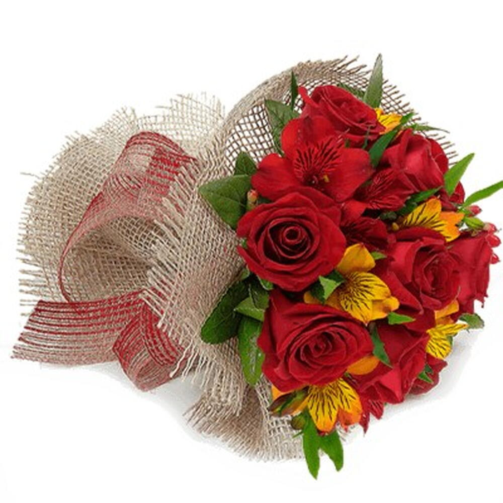 Um arranjo para conquistar corações - 10 rosas vermelhas e 6 astromélias amarelas envoltas em ruscus fresco e finalizado com uma elegante tela de juta. Ideal para presentear em qualquer ocasião especial.